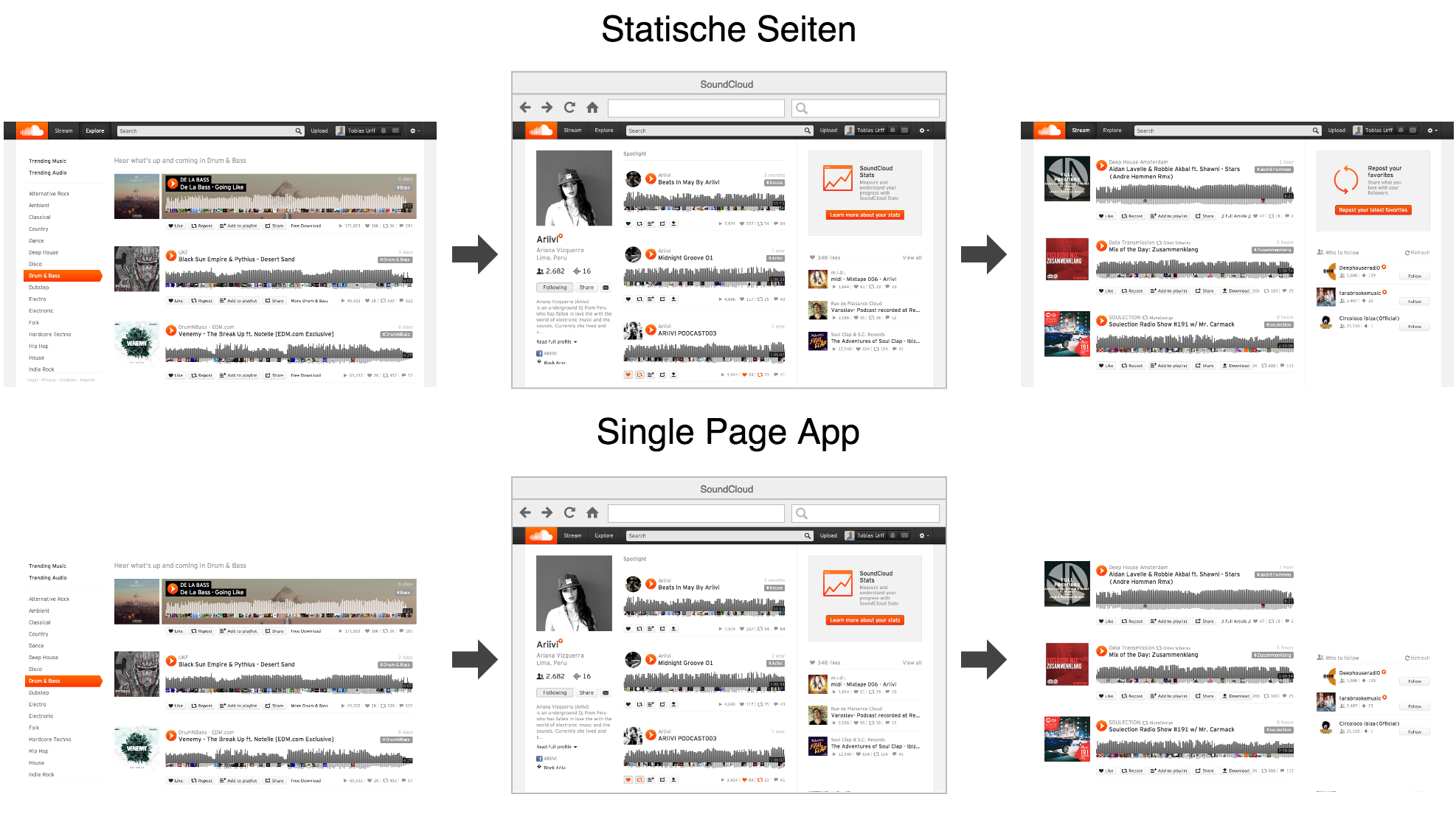 Schauen wir uns SoundCloud als Beispiel an. Wenn ich die Homepage öffne, wird eine komplette Seite mit Header, Navigation und Inhalt heruntergeladen. Klicke ich nun auf einen Link, wird nicht erneut die gesamte Seite heruntergeladen, wie das bei einer klassischen Seite der Fall wäre. Anstelle dessen wird nur der Inhalt, der sich ändert, geladen und in der existierenden Seite ausgetauscht.