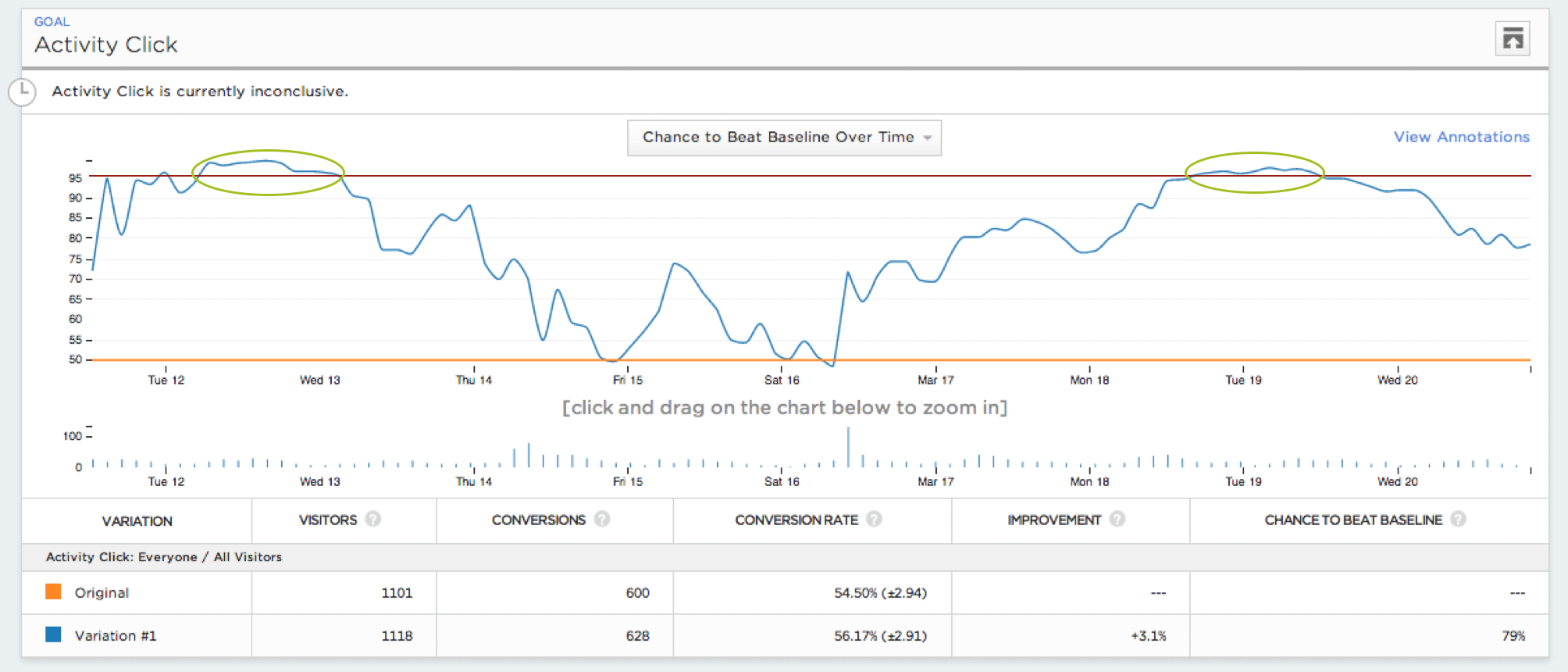 Von der Stats Engine wurden 39 % weniger abschließende Testergebnisse zurückgegeben als bei der Nutzung traditioneller statistischer Methoden. Dieser Wert sieht zwar alarmierend aus (wir waren zunächst auch besorgt), wir haben allerdings herausgefunden, dass viele der Experimente zu früh beendet wurden.
