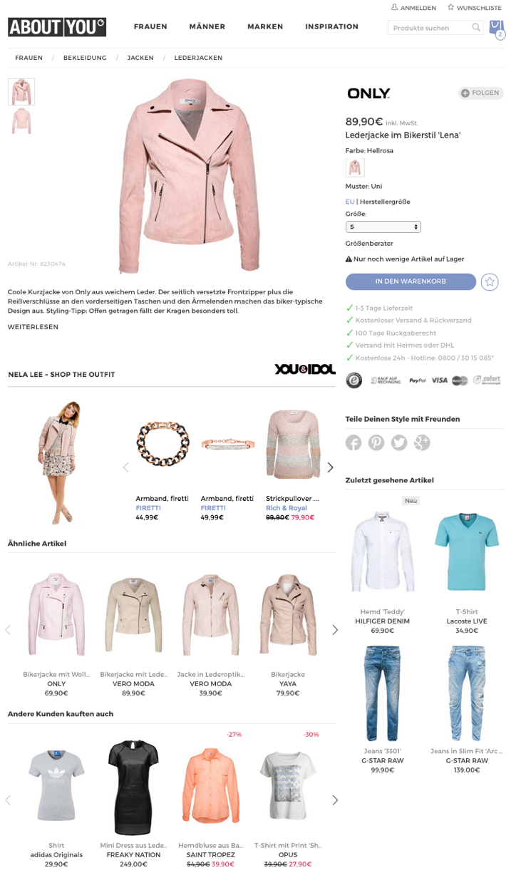 Die Detailseite dagegen zeigt wesentlich mehr: Produktempfehlungen, Social Trust-Symbole, die Artikelbeschreibung und Service-Versprechen wie Informationen zum Versand oder zu Retouren: